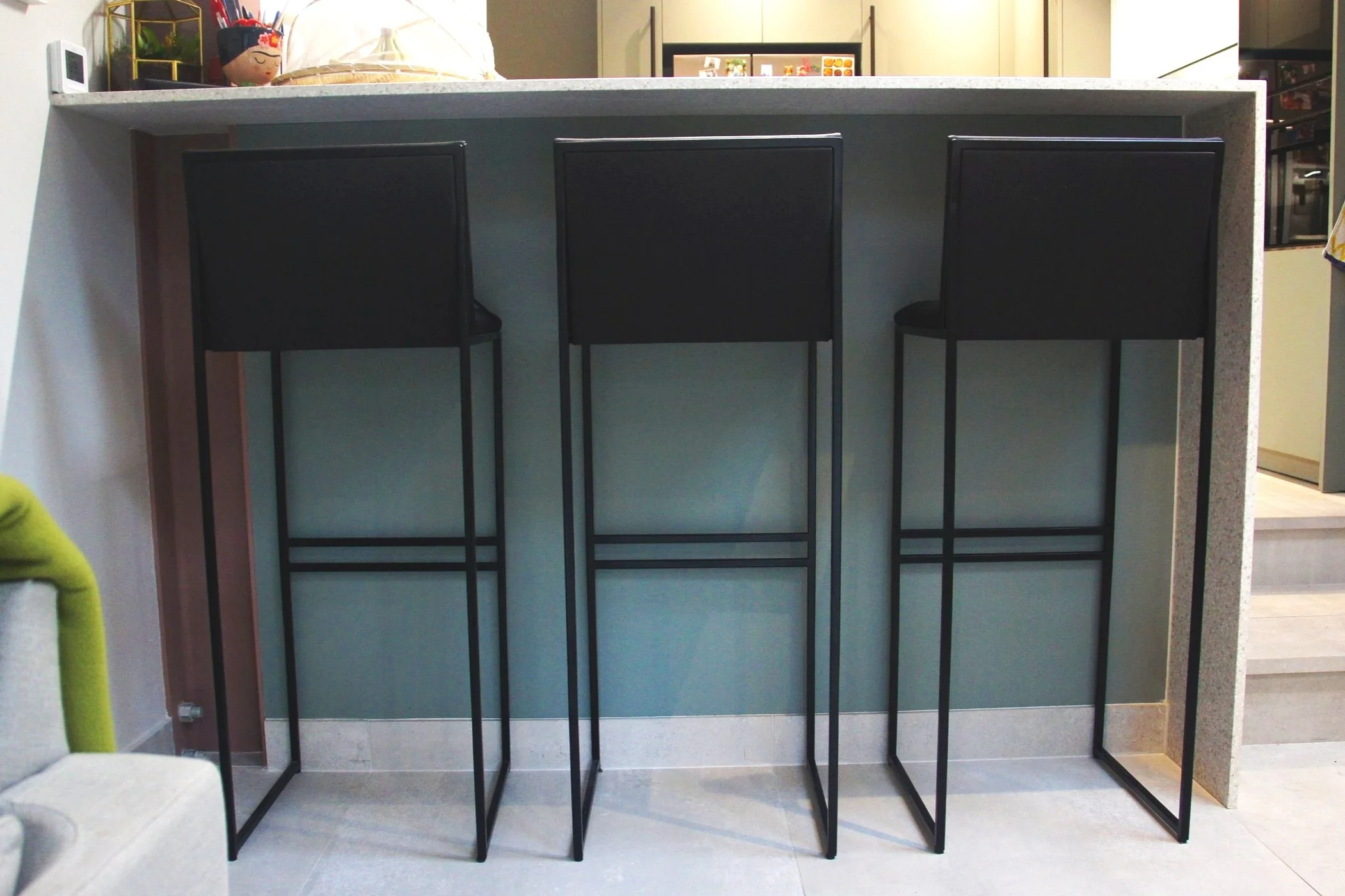 Their breakfast bar is a real design point and quite high up because there is a step down into the family room. It looks great, but they couldn’t source high enough stools so they had to get bespoke stools made.