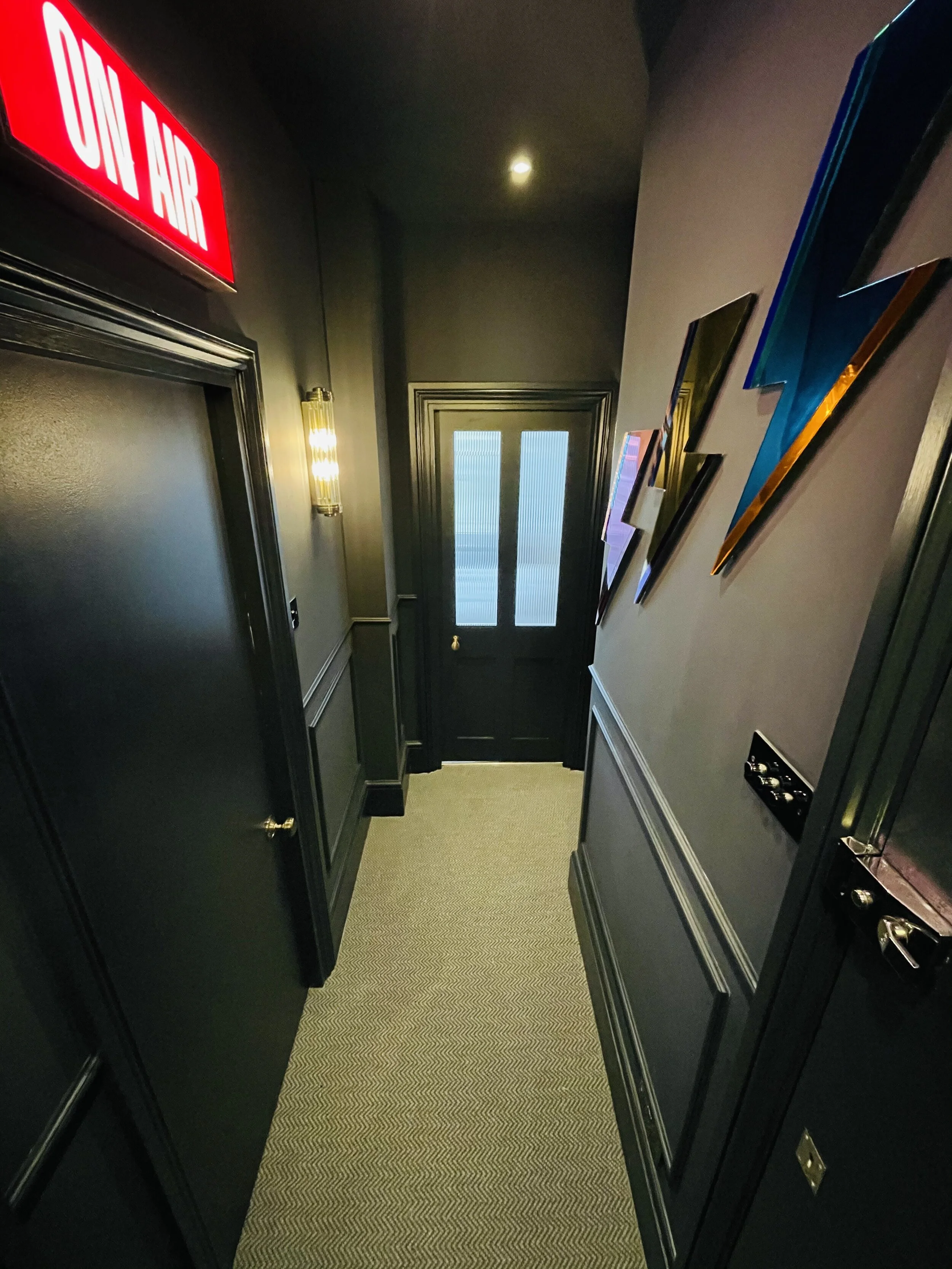 “I wanted texture on the bottom half of the wall so myself and Tijs discussed options and I went with wood panelling. I sourced and was quite specific about the paint colour (Farrow and Ball - Railings). I also sourced the doors, reeded glass effect sheeting which is stuck onto the glass and wall lights.